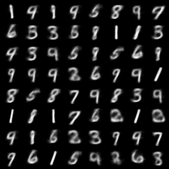 There are two cool things about VAEs: the first is that, for new observations, we can estimate the likelihood of said observation belonging to our model, which can be used to devised anomaly detection routines. The second is that we can generate new samples by simply unplugging the encoder and feeding unit Gaussian noise directly onto the decoder! Below are some randomly generated samples:
